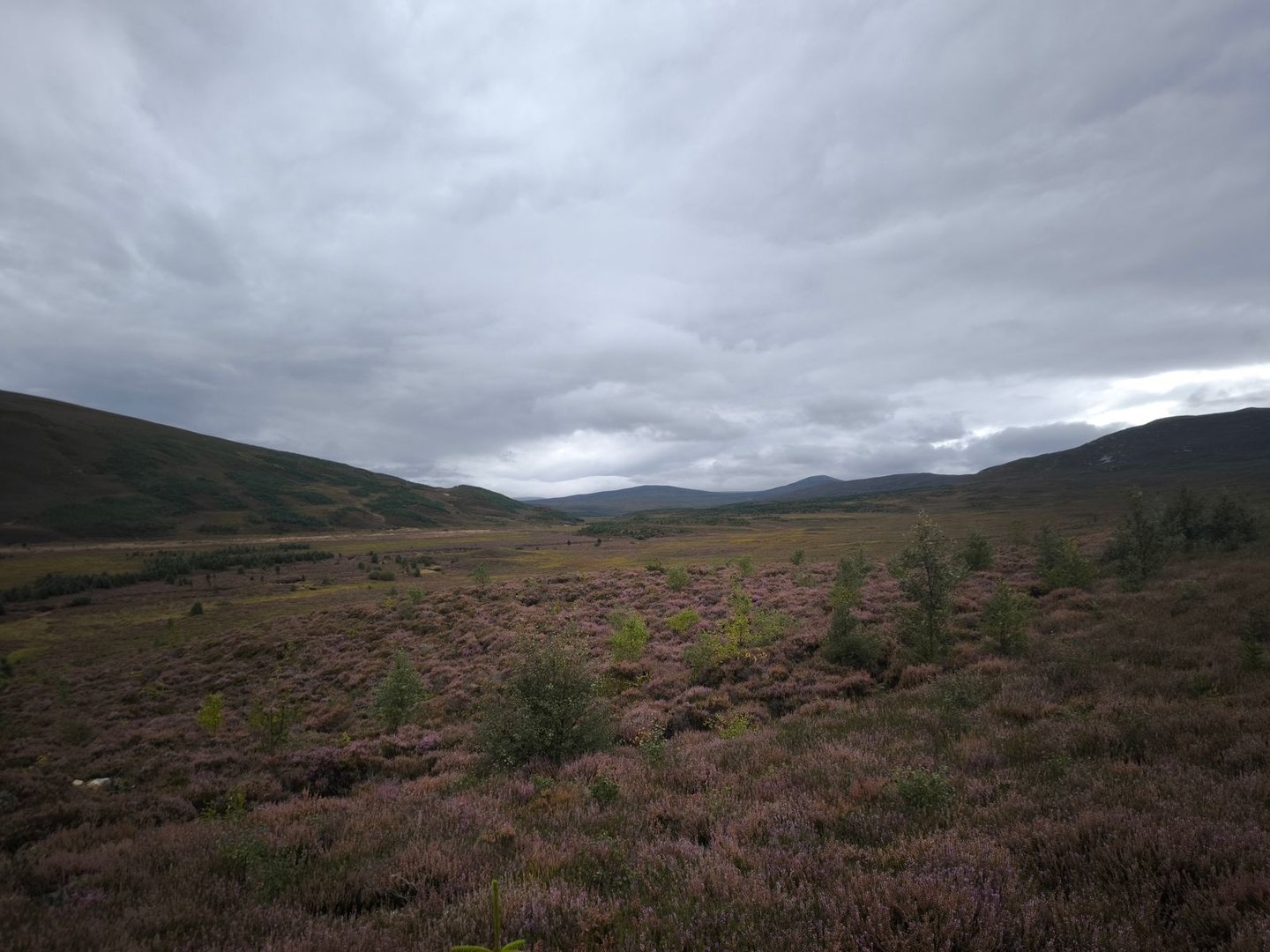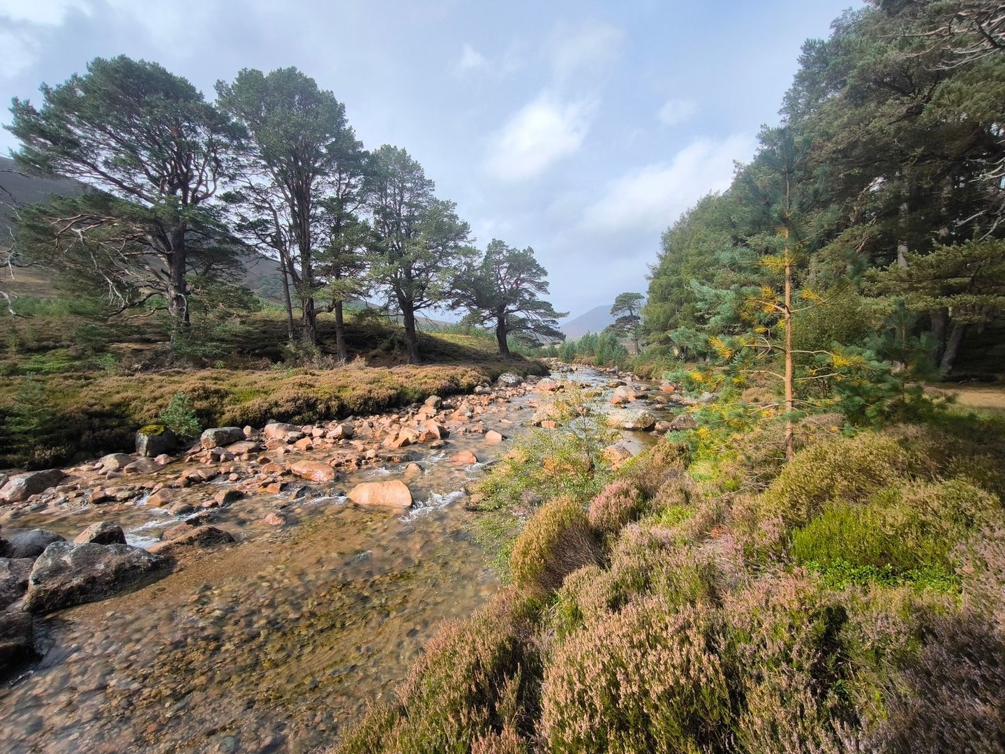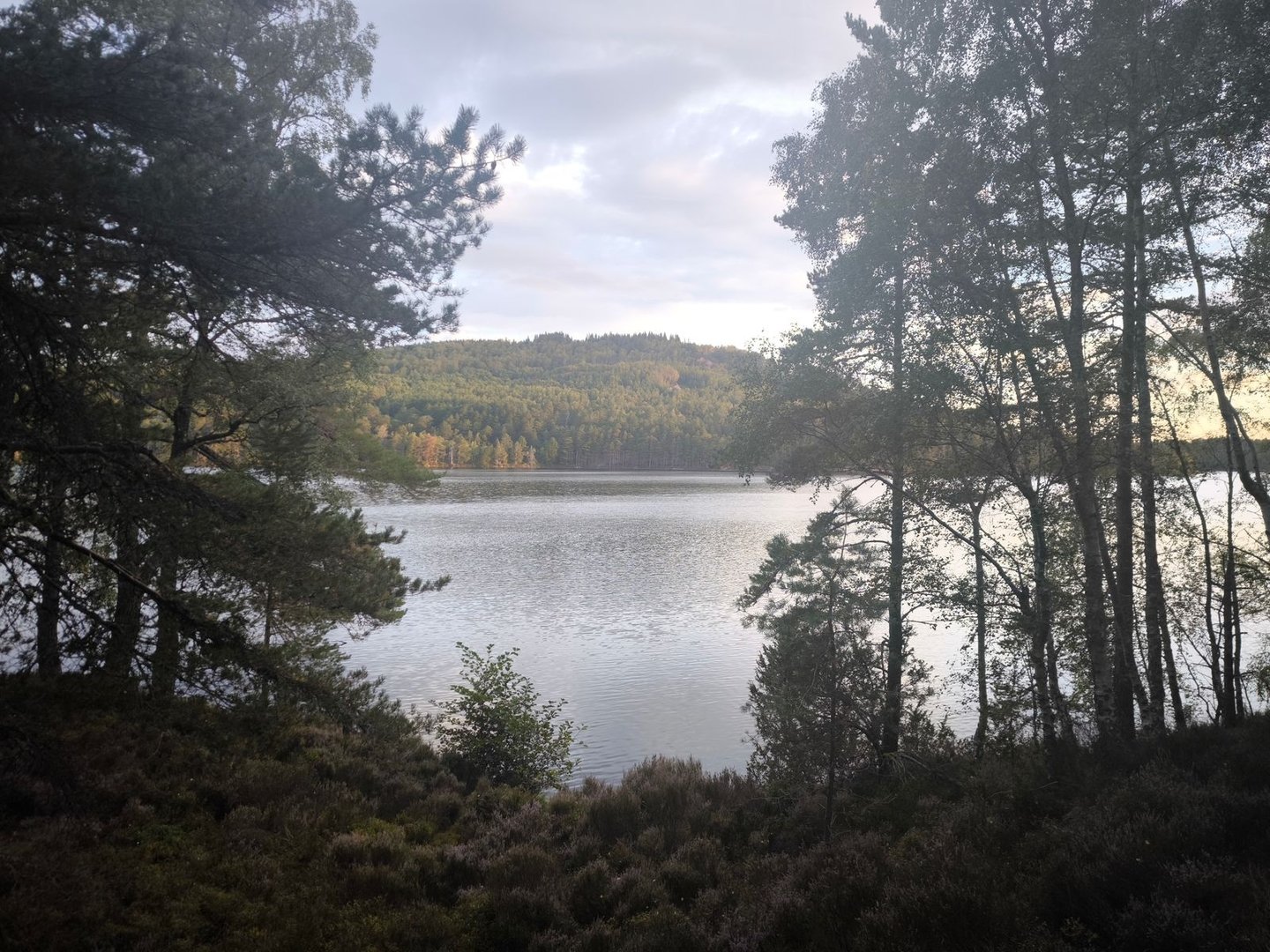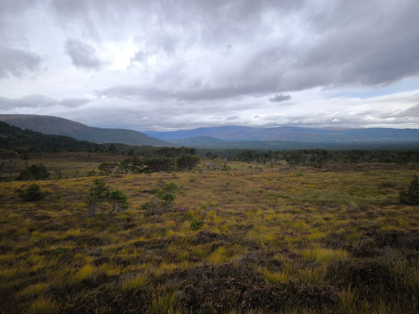 Gleich nach dem Start ging es durch eine wunderschöne Heidelandschaft mit vielen jungen Birken und Kiefern vorbei an einer Station zur Vogelbeobachtung mit einem weiten Blick über ein Feuchtgebiet (also noch leicht feuchter als der Rest der Cairngorms 😀).