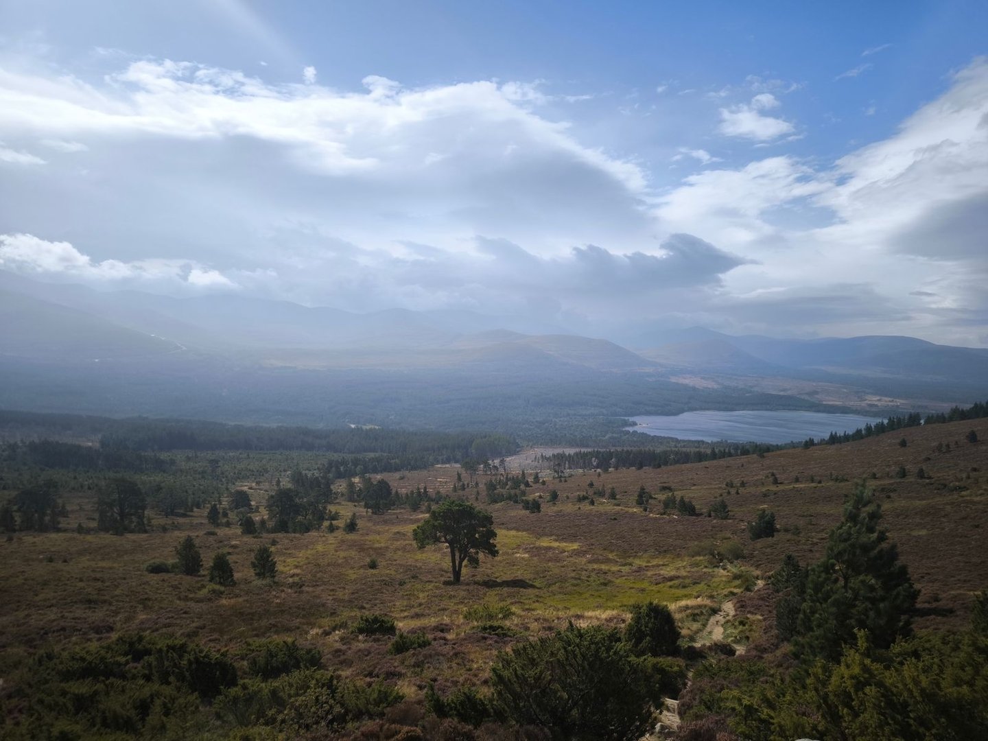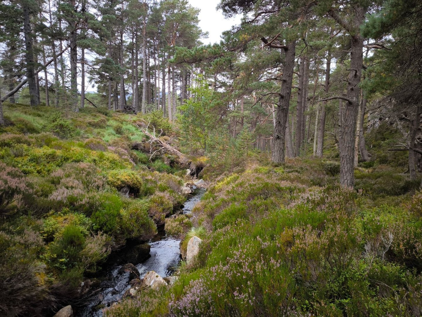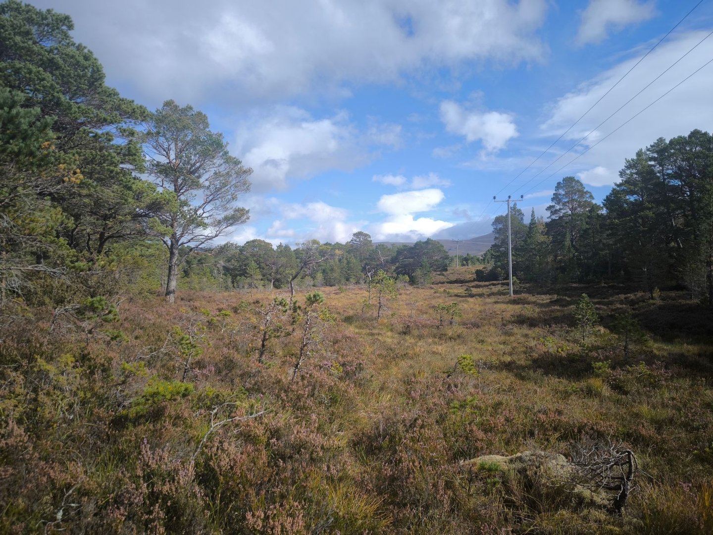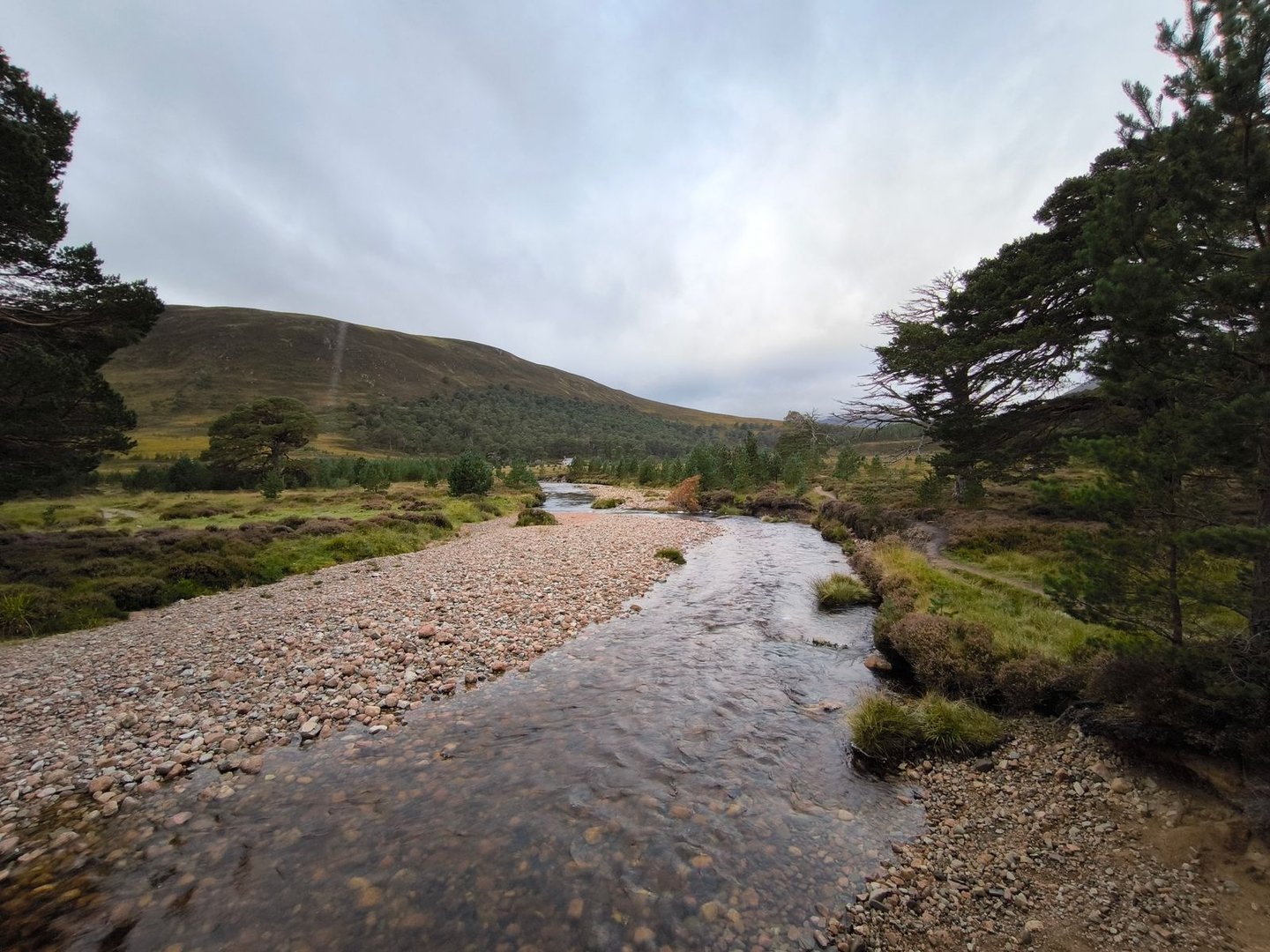 Gleich nach dem Start ging es durch eine wunderschöne Heidelandschaft mit vielen jungen Birken und Kiefern vorbei an einer Station zur Vogelbeobachtung mit einem weiten Blick über ein Feuchtgebiet (also noch leicht feuchter als der Rest der Cairngorms 😀).