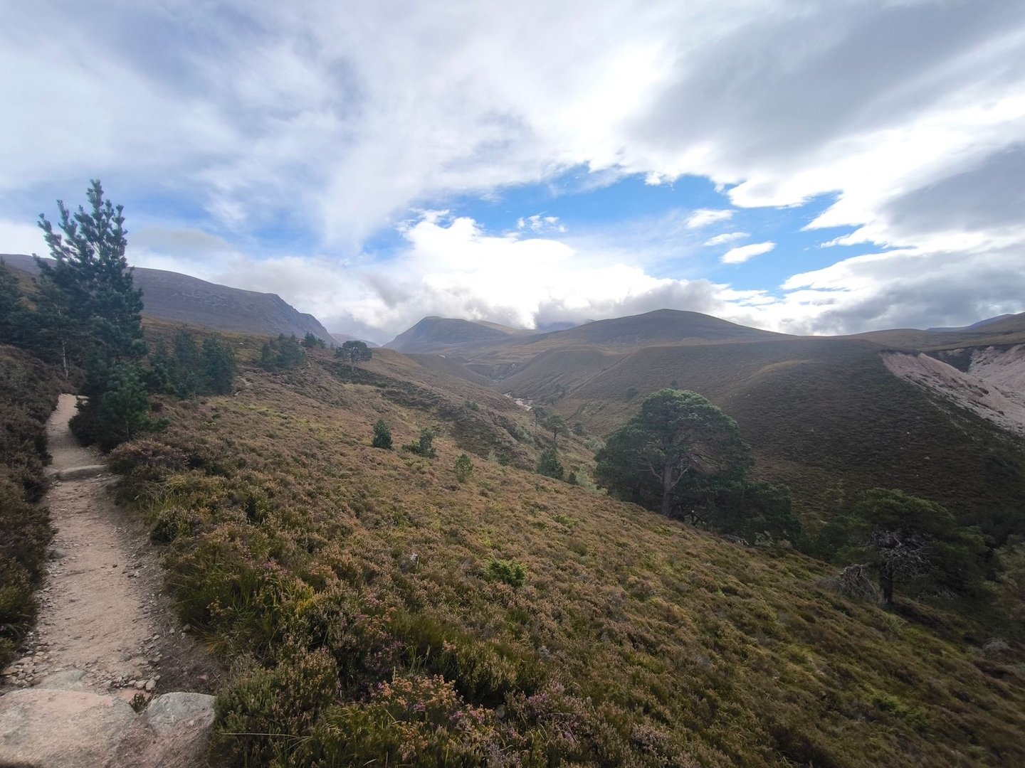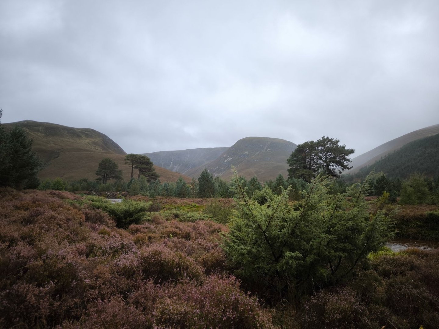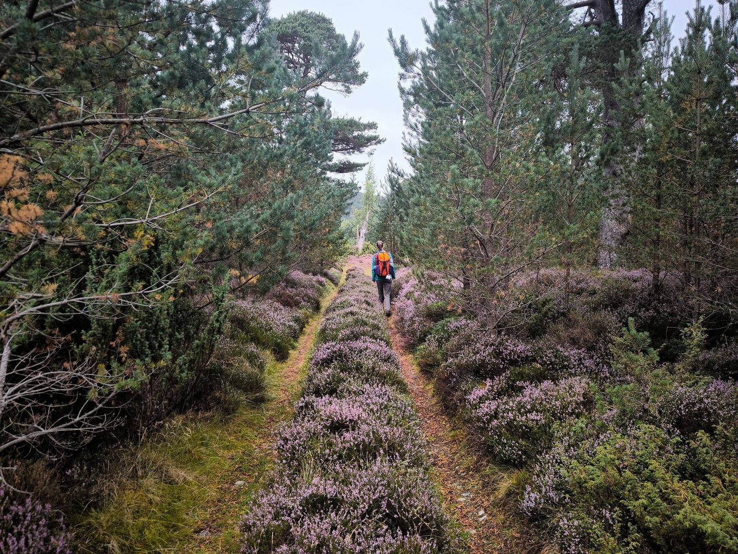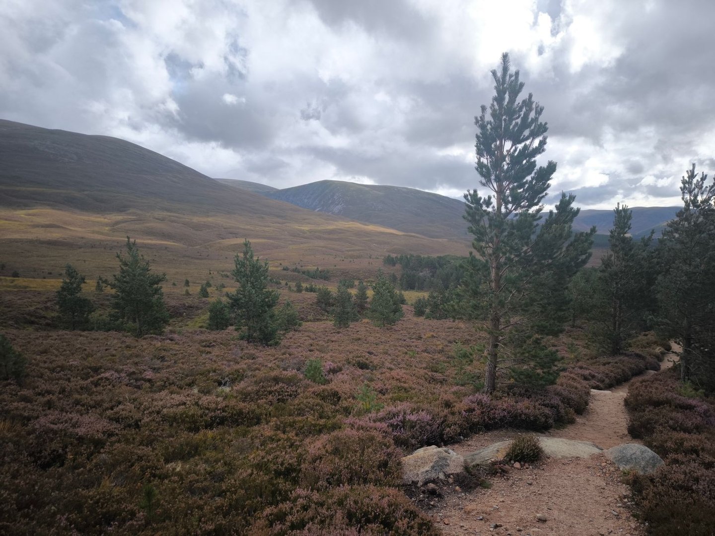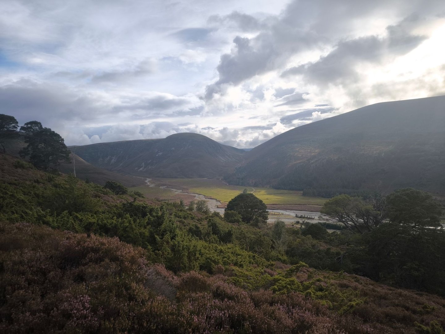 Gleich nach dem Start ging es durch eine wunderschöne Heidelandschaft mit vielen jungen Birken und Kiefern vorbei an einer Station zur Vogelbeobachtung mit einem weiten Blick über ein Feuchtgebiet (also noch leicht feuchter als der Rest der Cairngorms 😀).