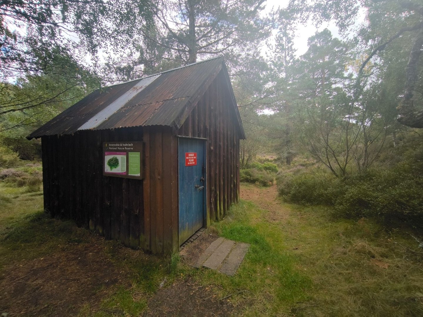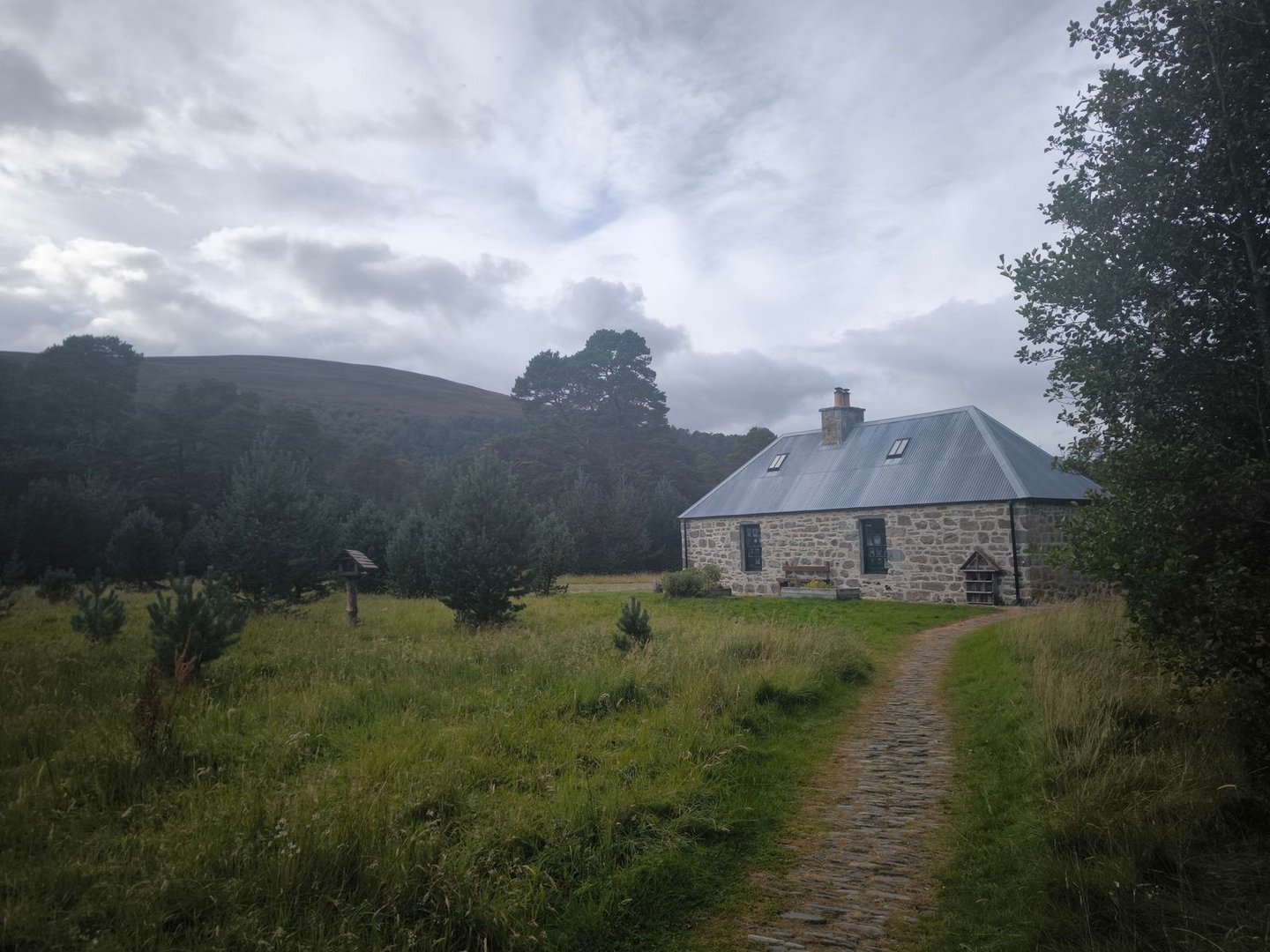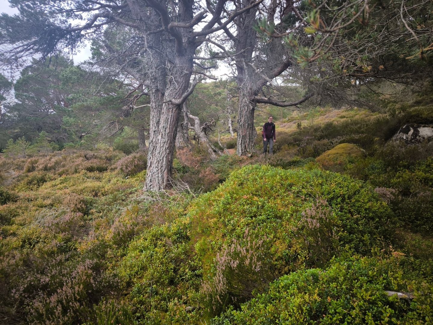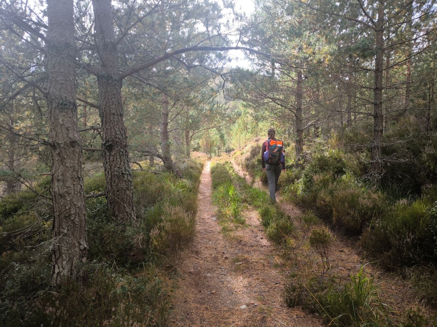 Gleich nach dem Start ging es durch eine wunderschöne Heidelandschaft mit vielen jungen Birken und Kiefern vorbei an einer Station zur Vogelbeobachtung mit einem weiten Blick über ein Feuchtgebiet (also noch leicht feuchter als der Rest der Cairngorms 😀).