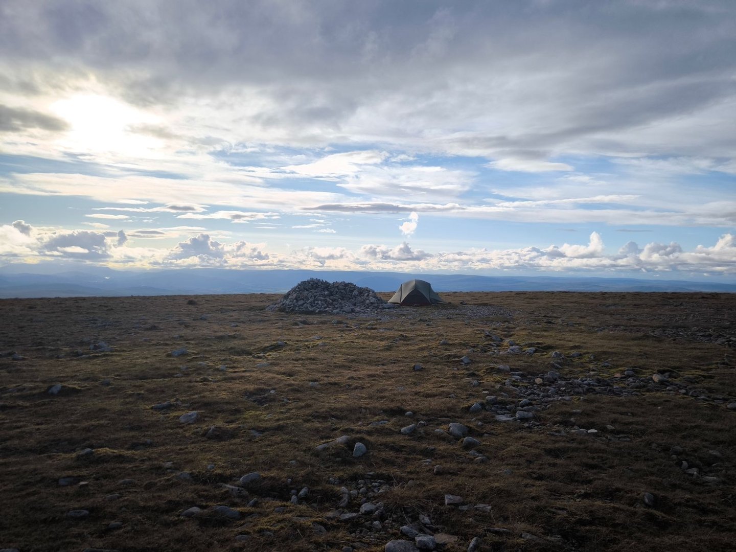 Oben angekommen wurde dann erstmal das Zelt aufgestellt und Abendessen gekocht, bevor ich mich dann noch zu einem kurzen Spaziergang zum nächsten Gipfel entschloss (BESTE ENTSCHEIDUNG EVER). Das Wetter und die Sicht waren absolut grandios und während ich die Aussicht über Loch Einich genoss, landete vlt. 30m von mir entfernt ein Steinadler, musterte mich kurz, gab mir Zeit für ein Foto und flog dann seiner Wege.