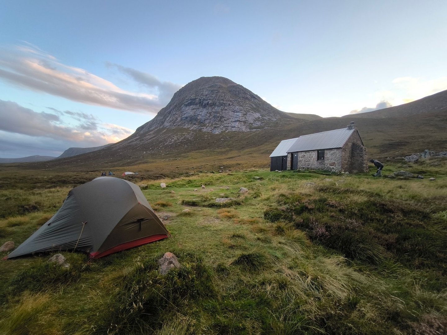 Nach einigen netten Gesprächen in und um die Bothy entschieden wir uns dann, nicht mehr weiterzugehen, sondern nahe der Bothy das Zelt aufzustellen, auch weil der teils sehr ruppige Abstieg unsere Knie nicht ganz glücklich zurückgelassen hatte.
