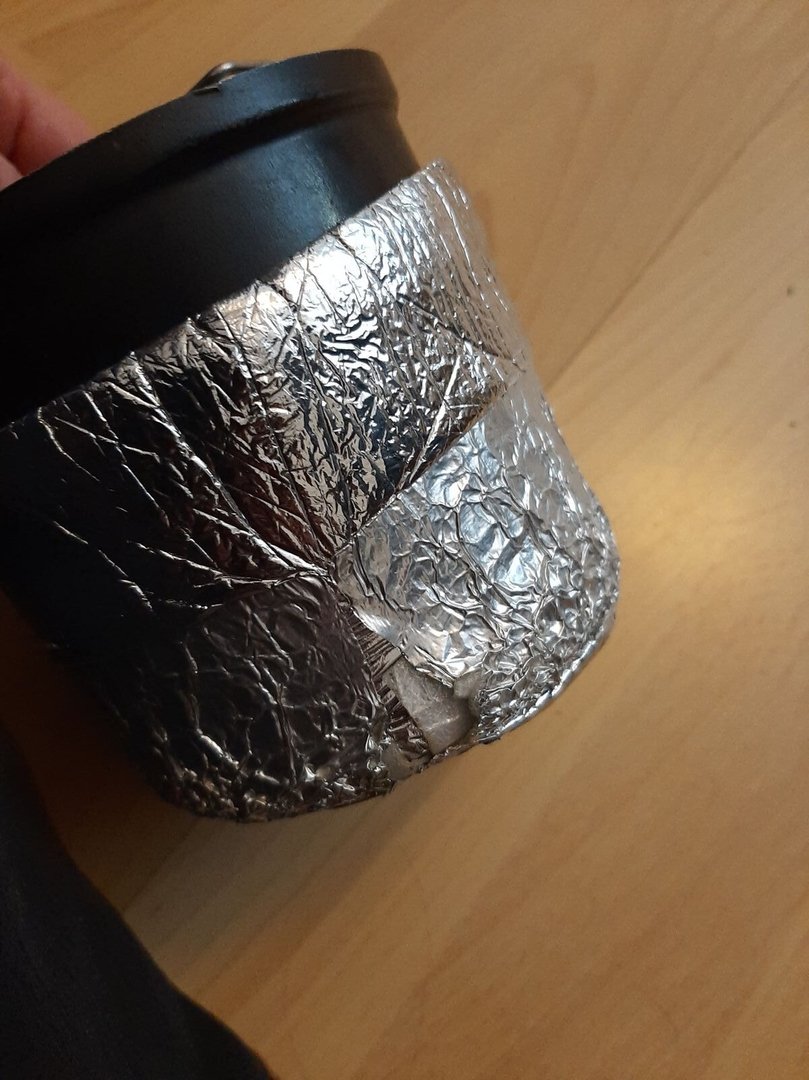 Hier ein paar Bilder von der quick&dirty-Schönheit. Anfangs - vor Jahren - war sie mehr oder weniger passgenau für den abgebildeten Topf. Auf dem letzten Foto sind u.a. Rußspuren von der letzten Hoboaktion, plus die weiße Seite, wo offen, am Rand teils abgetragen.