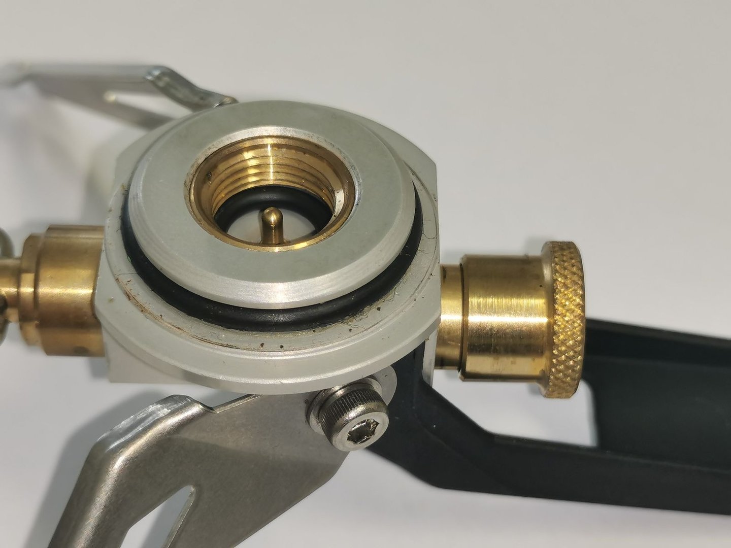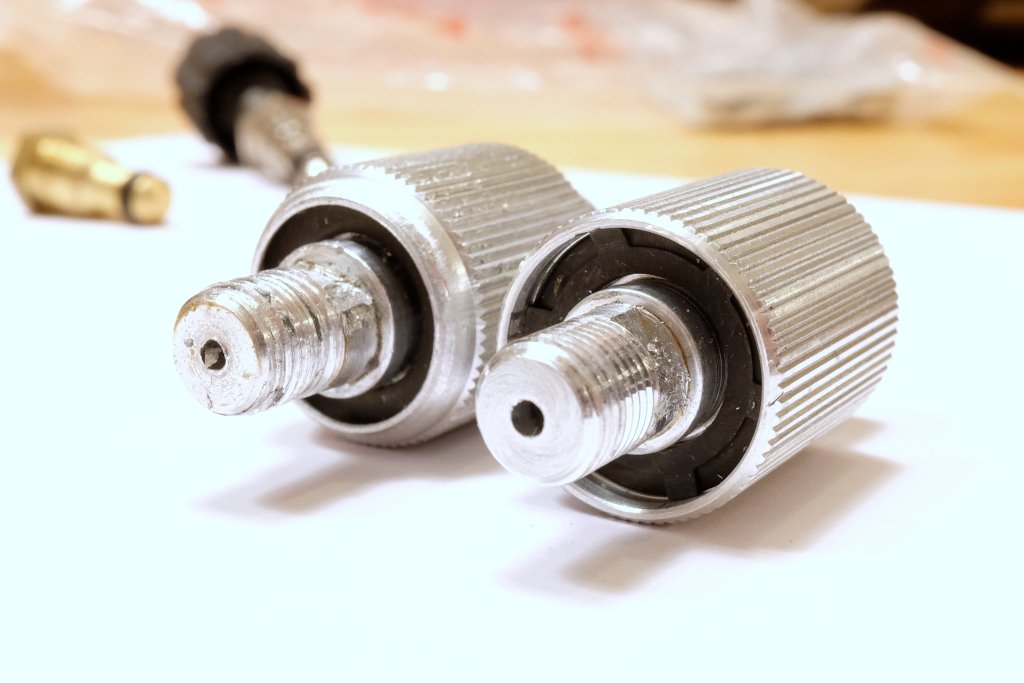 Nach Demontage des alten Lindal-Ventils und des gegenüberliegenden Blindstopfens konnte der Pumpenkopf zur verbesserten Rundheit mit einem Dreischneider auf den notwendigen Kernlochdurchmesser aufgebohrt werden. Anschließend wurde mit einem Sacklochgewindebohrer ein zylindrisches G1/8” Gewinde eingebracht, woraufhin die CEJN-Schnellkupplung eingeschraubt und mit Teflonband abgedichtet werden konnte. Die nun ungenutzte Öffnung des Verschlussstopfens auf der gegenüberliegenden Seite der Schnellkupplung wurde mit der Ventilspindel des VariFuel-Kochers versehen, wobei es sich um identische Gewinde und Bauformen der Spindel handelt. Damit war zumindest hier keine Anpassung notwendig. Alle Teile wurden vor der Montage entsprechend abgedichtet bzw. mit Trockenschmierpaste versehen.
