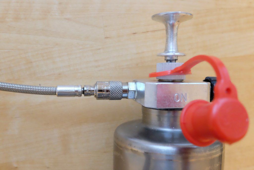 Beim Primus-System gefällt mir insbesondere das zusätzliche Ventil zum Abstellen der Brennstoffzufuhr unmittelbar in Pumpennähe. Neben dem üblichen Nadelventil am Brennerkopf besitzt der Kocher damit noch eine weitere Möglichkeit zum Abschiebern der Brennstoffzufuhr, was ich aus Sicherheitsgründen begrüße. Zwar hat Optimus diese Funktionalität bei den neueren Pumpen ebenfalls nachgerüstet, dort aus Kostengründen aber leider keine professionelle Industrie-Schnellkupplung mehr verbaut. Stattdessen kommt hier nun ein proprietärer Bajonett-Anschluss zum Einsatz. Bei den älteren Nova-Pumpen entfällt das zusätzliche Ventil hingegen vollständig, weshalb ich nicht einfach nur eine alte Nova-Pumpe mit Schnellkupplung, dafür aber ohne Ventil mit dem OmniLite-Brennerkopf kombinieren wollte.
