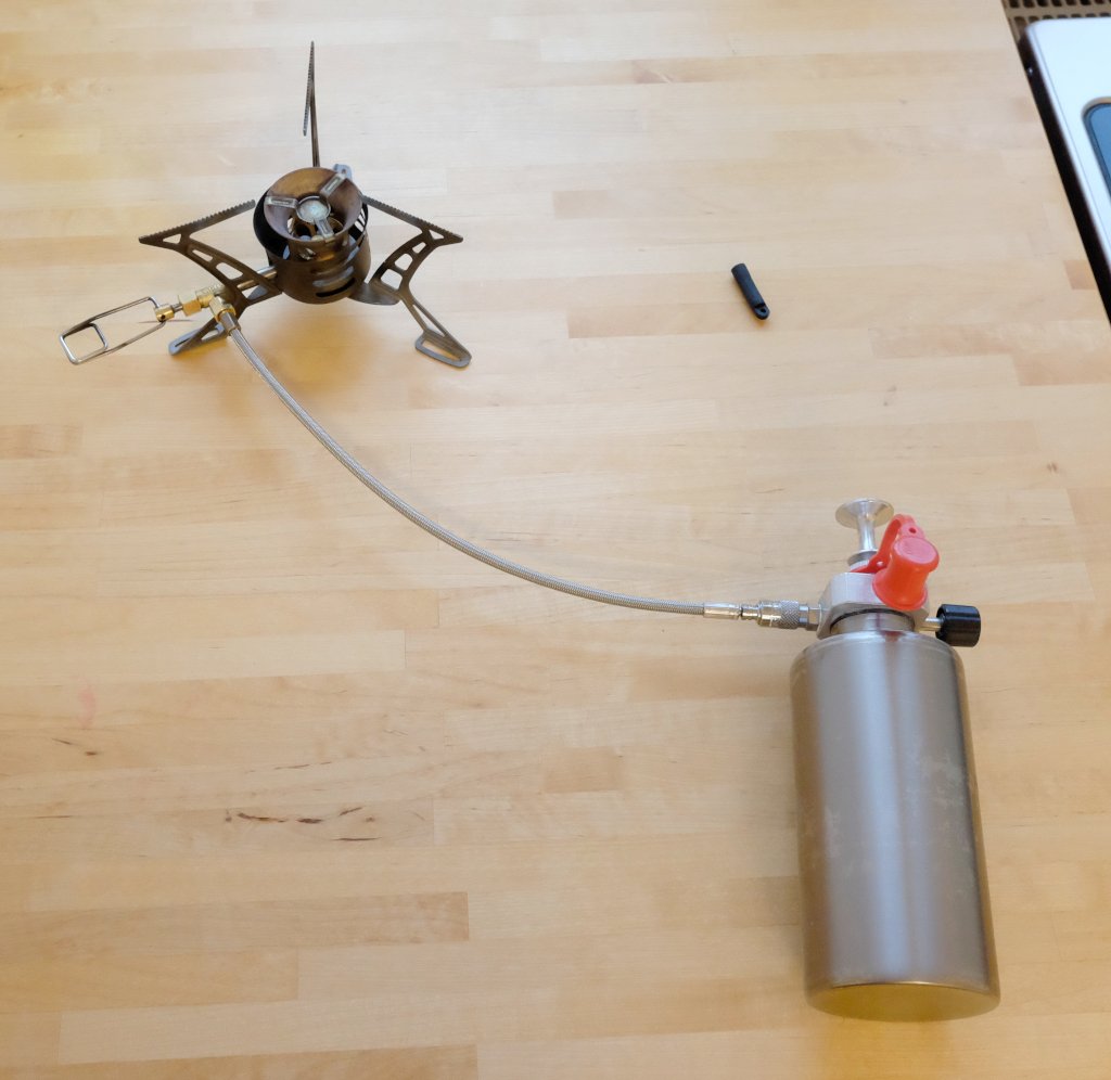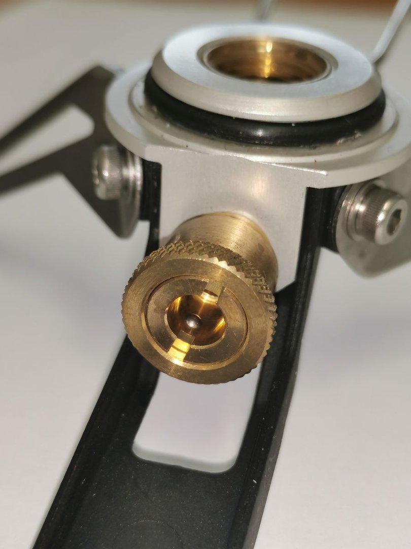 So sehr ich diesen Kocher schätze, so sehr stören mich doch einige seiner Besonderheiten. Zur universellen Verwendbarkeit mit Flüssigbrennstoff und zusätzlich auch mit Gaskartuschen hat Primus der Brennerzuleitung ein so genanntes Lindal-Ventil spendiert. Damit kann der Schlauch des Brennerkopfes auch auf handelsübliche Flüssiggaskartuschen geschraubt werden, womit das System als herkömmlicher Schlauchkocher ("Remote Gas Stove") nutzbar wird. Dies ist in meinem Falle jedoch irrelevant, da ich Gaskartuschen nicht nutze.