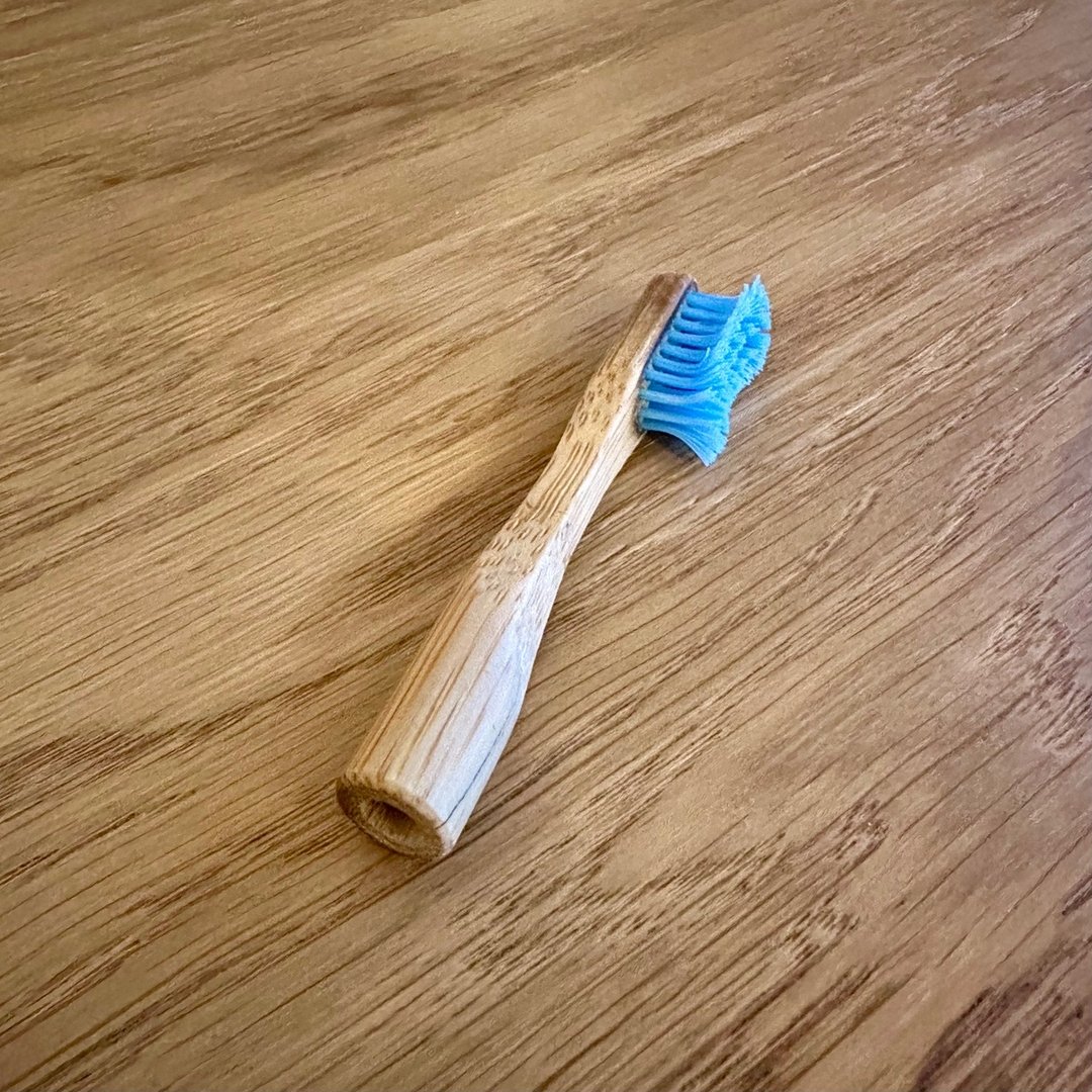 Im Drogeriemarkt gibt es solche Zahnbürsten aus Bambus mit austauschbaren Köpfen. Der Kopf hat sogar ein “Loch” zum Aufstecken auf den Stiel. Das macht ihn besonders ultraleicht. 😉