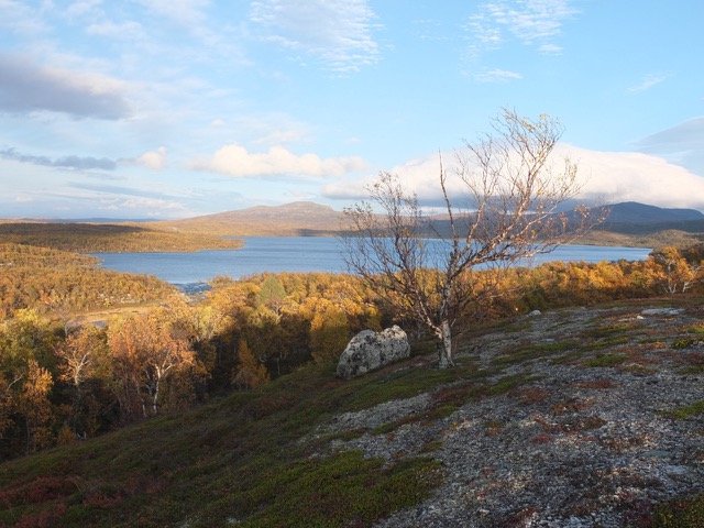 Der Weg führt erneut durch offenes Fjäll. Ich verlasse den Pfad und steige auf eine der höchsten Erhebungen der Umgebung. Wie erhofft, habe ich oben mit dem Handy Empfang und kann kurz zuhause anrufen. Querfeldein geht es weiter, um etwas später wieder auf meinen markierten Pfad zu stoßen. Dabei stoße ich auf einen See in Herzform.