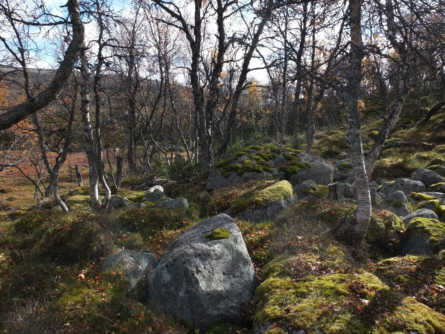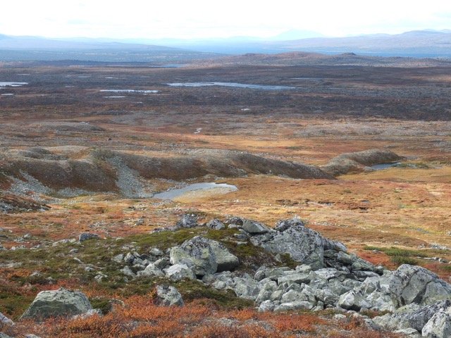 Neuer Plan: Zurück bis zu dem gestern gekreuzten markierten Pfad, diesem nach Ljøsnåvollen folgen und von da einen weiteren markierten Pfad in Richtung Süden. Südlich des markierten Pfades zwischen Reva und Svukuriset, den ich, wie eingangs beschrieben, vor Jahren gegangen bin, sollte ich mich aufgrund markanterer Berge wieder besser orientieren können. Ich hoffe darauf, dort wieder zu weglos wechseln zu können. Der oben am Hang stetig wehende Wind ist kalt und unangenehm. Ich wechsle daher nach unten in die Ebene - auch, weil ich Lust auf etwas anderes habe, wo ich nun schon wieder zurück muss. Das Umlaufen der Sümpfe und Moräne rauf, Moräne runter ist zwar anstrengender, dass sich die Abwechslung durch den Landschaftswechsel positiv auf meine Stimmung auswirkt, wiegt aber deutlich schwerer.