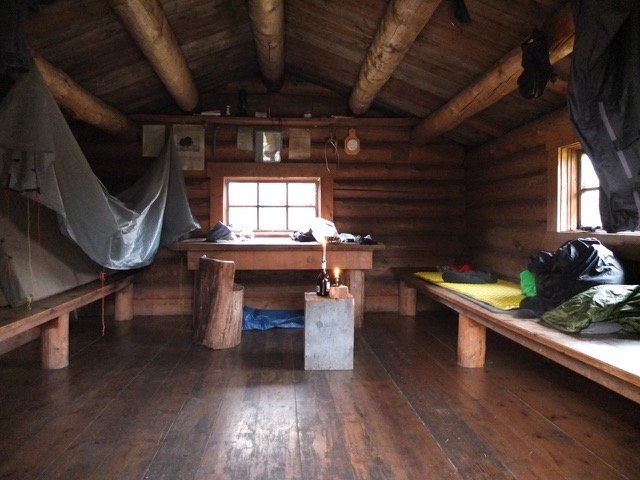 Eine der Hütten ist verschlossen. Die zweite ist von der Statskog und offen. Hier lege ich eine Rast ein. Dort treffe ich auf einen älteren Herrn, der in neongelber Signalweste im Auftrag von Statskog durch die Berge streift, um Jäger zu kontrollieren und hier ebenfalls seine Mittagspause verbringt. Zu der Zeit werden in dieser Gegend Vögel gejagt. Wie die bejagten Vögel auf Englisch heißen, weiß er nicht und die Jäger, die ich treffe, vergesse ich zu fragen.