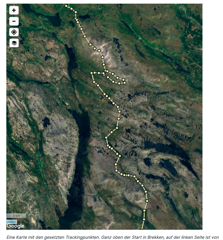 Packliste siehe hier: klick.Eine Karte mit den gesetzten Trackingpunkten. Ganz oben der Start in Brekken, auf der linken Seite ist von der Bildmitte bis zum unteren Rand der Femundsee zu sehen, auf der rechten Seite knapp unterhalb der Bildmitte der Rogen. Die letzten paar Kilometer sind nicht mehr drauf. Der letzte Trackingpunkt am unteren Bildrand ist in Sylen an der Nordspitze des Sees Grövelsjön gesetzt. Da ging es dann nur noch westlich des Sees über den Berg rüber.