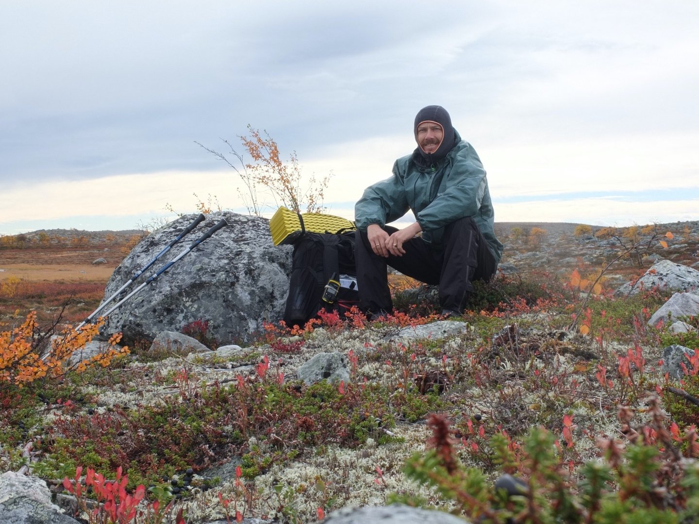 Hier gibt es eine große Tafel mit Informationen zum Nationalpark sowie einer Karte mit den markierten Pfaden. Diese fotografiere ich ab, womit sich mein Orientierungsproblem erstmal erledigt hat. Als ich gerade aufbrechen möchte, kommt ein aufgeweckter Hund zu mir her gerannt, um mich zu beschnuppern. Eine Gruppe von vier bis fünf Jägern mit weiteren Hunden marschiert grüßend an mir vorbei ins Dorf hinein. Ich mache mich auf in Richtung Muggsjølia. Der Pfad verläuft über eine spärlich bewachsene Hochebene und Wind und Regen peitschen mir ins Gesicht. Schuhe und Socken sind schon längst durchnässt. "Wind, Regen, nass, kalt, bäh" schreibe ich an dieser Stelle in mein Tourbuch. Plötzlich suppt ein Schwall Wasser in meinen Überhandschuh und mein dünner Fleeceliner darin ist sofort patschnass. Mir fällt ein Zitat von Simon ein, der mit dem Buch Norwegen der Länge nach. In irgend einem Tourbericht auf ODS schrieb er mal: "Manchmal muss man dem Wetter eine Chance geben."
