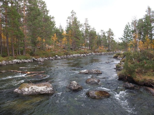 Ich bin schon eine Weile gelaufen, habe soeben eine am See Øvre Roasten gelegene, private Hütte passiert, da stoße ich auf einen Fluss, an dem ich nicht mehr weiter komme.