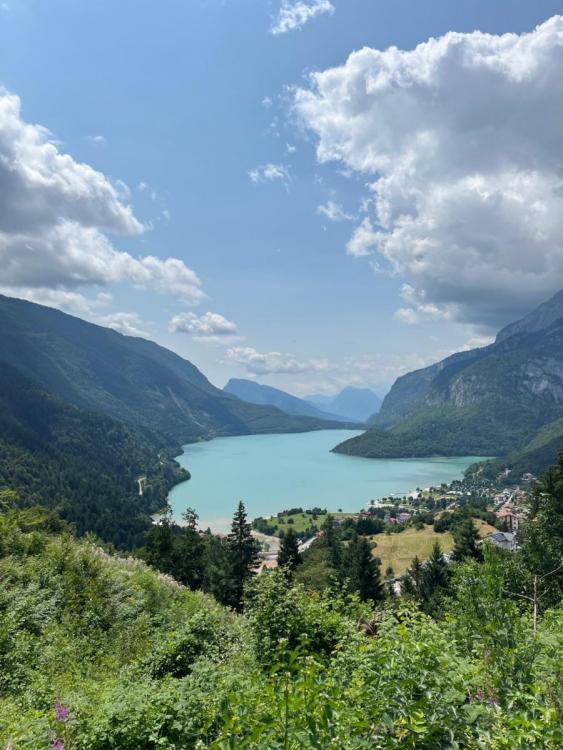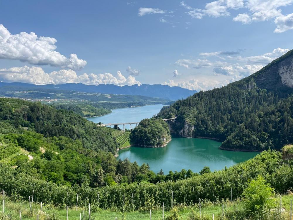 Nach der Königsetappe kann ja nur alles leichter werden. Nun ja. Nein. Weit gefehlt. Der Gampenpass war beinahe ebenbürtig. Und statt langer, flacher Anstiege bietet Südtirol kurze, steile, die gefühlt 10x anstrengender daher kommen. Genügend Häppchen für die Motivation gab es trotzdem: Die Blicke auf den Santa-Giustina-See. Mit zwei Müncher Wegbegleitern gab es abends eine köstliche Pizza abseits aller Touristenhochburgen. Heute ging es in die Herberge. Ein Bett tut nach drei Tagen richtig gut.